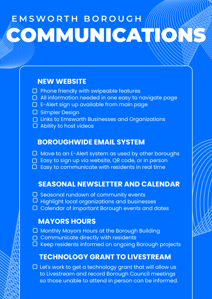 This is where I believe my professional background can be of best service to the Borough as Mayor. Facebook and NextDoor are great, but are used by a smaller percentage of citizens than simpler and more efficient tools such as email, text services, and newsletters. I would make a Mayor’s Monthly Newsletter which I would self distribute throughout the Borough. It would have a calendar of Borough and local events as well as useful information pertaining to being a citizen. I would provide free advertising in the newsletter for Emsworth businesses.